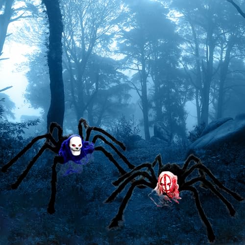 [2 Pack Halloween Spider Decorations] – Package includes 2pcs 30 inch spiders with blue and red ghost faces. These large hairy spiders are perfect for Halloween decoration. Whether it’s indoor or outdoor, it can perfectly match other terrifying decorations