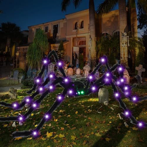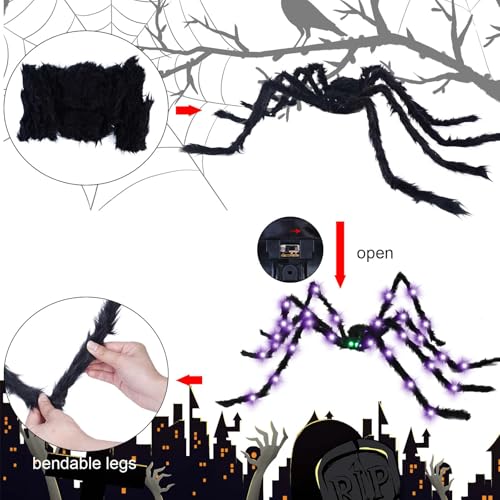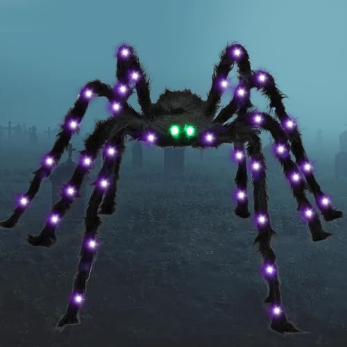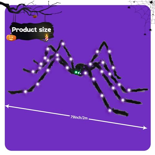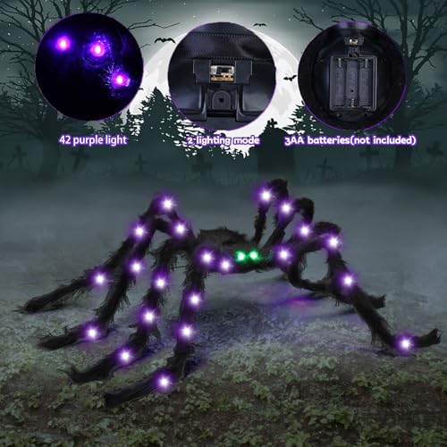Creepy Realistic Halloween Decorations:Package includes 1pcs light up spider(6.6Ft), Black hairy lighted spider has 42 LED lights, 2 for the green eyes, and the remaining 40 purple lights are distributed on its 8 legs,looks real and scary.