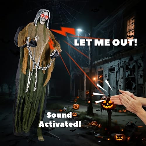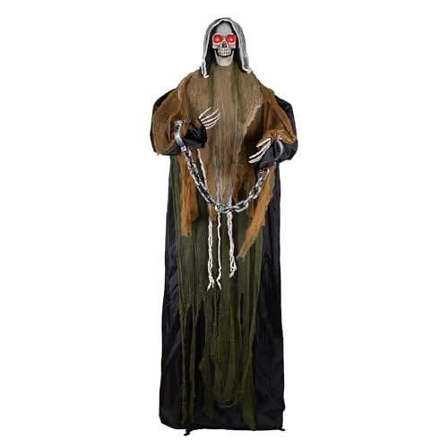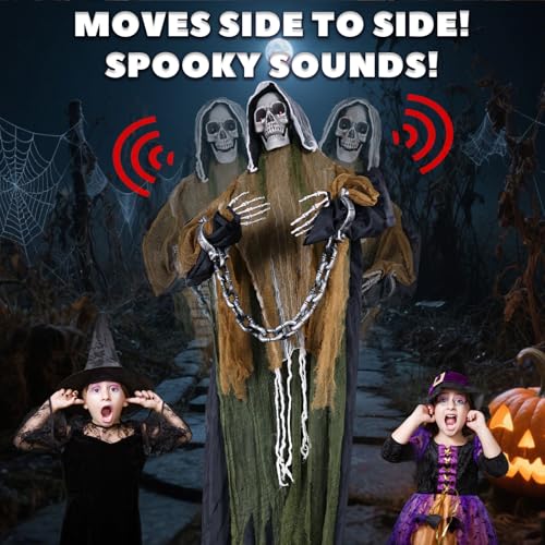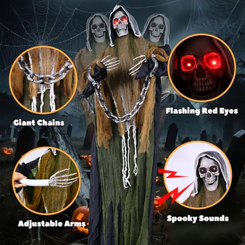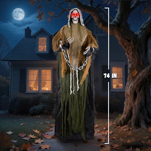Specification: 74″ Halloween Decorations Outdoor Life Size Animatronics Grim Reaper with Chain, Creepy Sound and Red Light-Up Eyes, Scary Haunted House Props for Yard Garden Lawn Party Decor