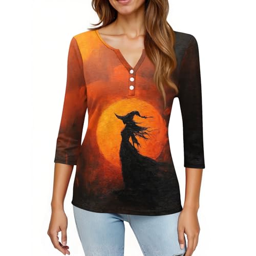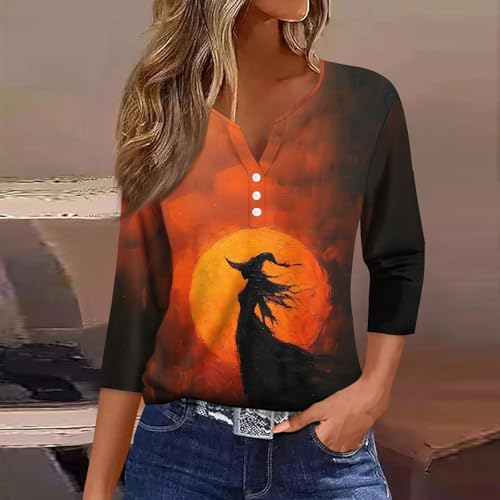 Halloween Henley Shirts for Women 3/4 Sleeve Witch Graphic Tees Vintage Festival Tops V Neck Sweatshirts Funny Costumes
