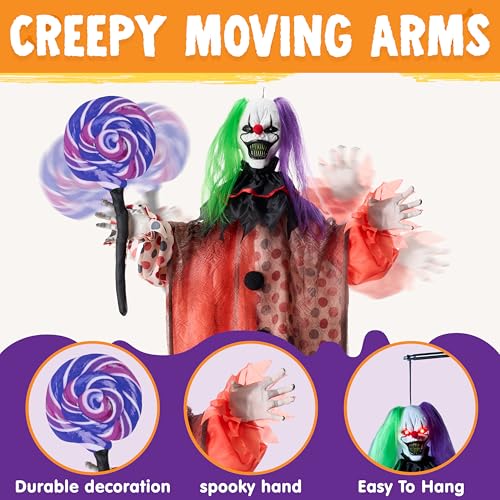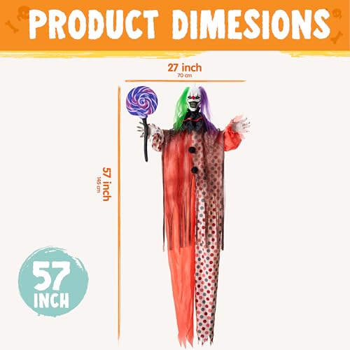 Specification: JOYIN 53″ Halloween Hanging Clown Decorations Outdoor, Scary Animated Decor Waving Arm with Sound and Red Light Up Eyes Sound Activated Screaming Yard Props for Indoor Haunted House Party Lawn