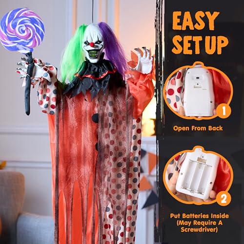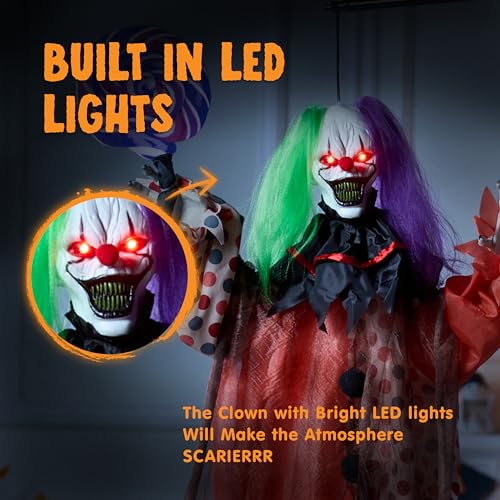JOYIN 53″ Halloween Hanging Clown Decorations Outdoor, Scary Animated Decor Waving Arm with Sound and Red Light Up Eyes Sound Activated Screaming Yard Props for Indoor Haunted House Party Lawn