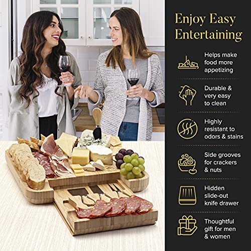 Premium Bamboo Cheese Board and Knife Set – Charcuterie Board With Hidden Drawer – Deep Grooves, Wine Cheese Set – Elegant Gift Idea